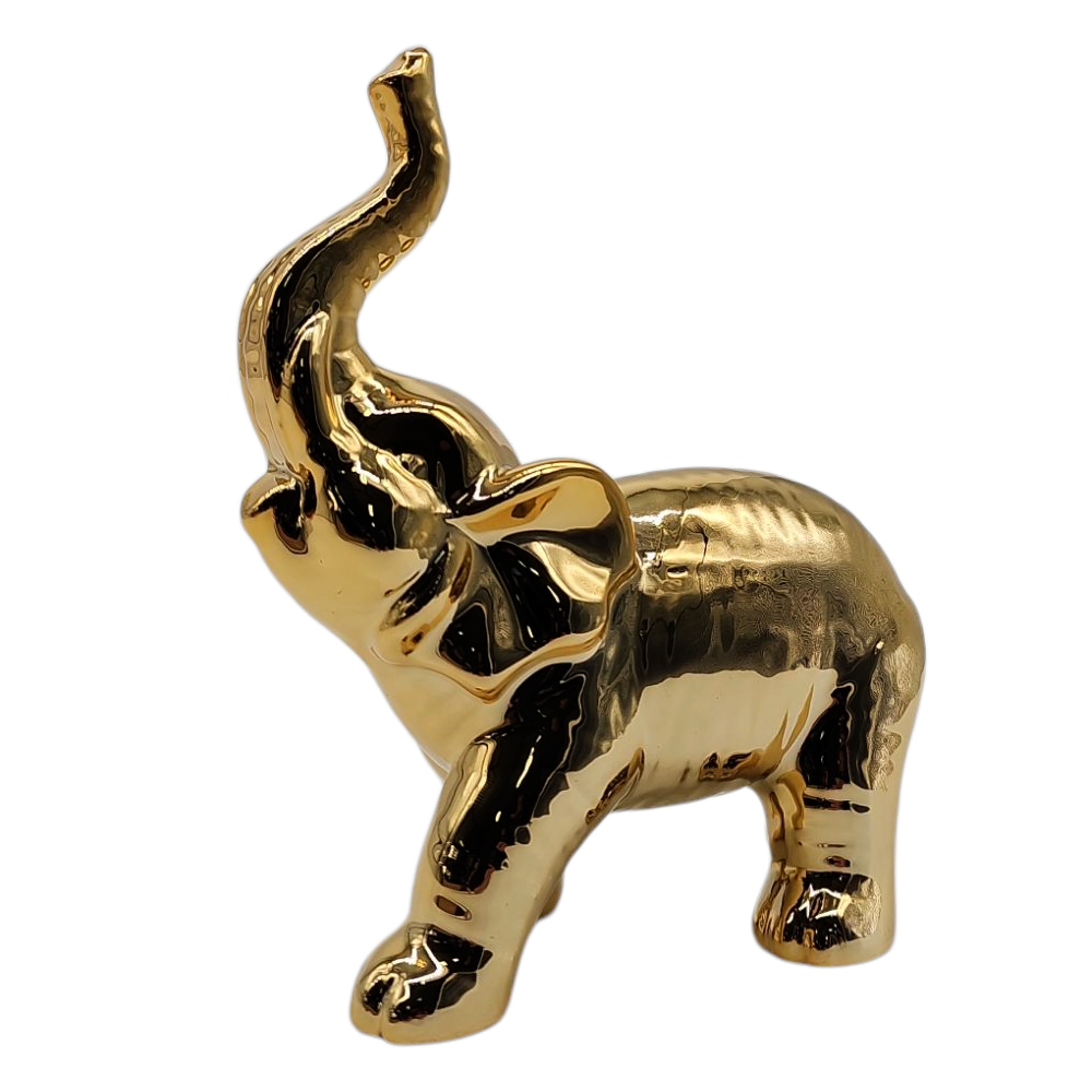 Wykonana z wysokiej jakości ceramiki, figurka została pokryta efektowną, lustrzaną powłoką w kolorze złotym. Jej błyszcząca powierzchnia pięknie odbija światło, tworząc subtelne refleksy i przyciągając wzrok. Precyzyjne odwzorowanie detali – takich jak uniesiona trąba, wyraźne linie uszu i harmonijna sylwetka – nadaje jej wyjątkowego charakteru.