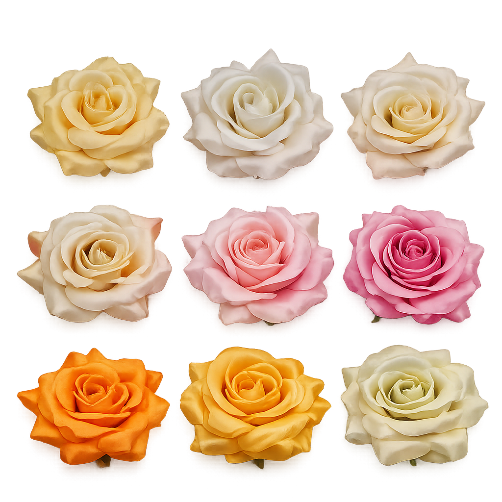 Każda główka została starannie wykonana z dbałością o detale – warstwowe, miękko układające się płatki wiernie odwzorowują naturalną strukturę róży. Subtelne przejścia kolorystyczne oraz delikatne wykończenie sprawiają, że kwiat prezentuje się niezwykle realistycznie, zarówno z bliska, jak i w większych aranżacjach.
