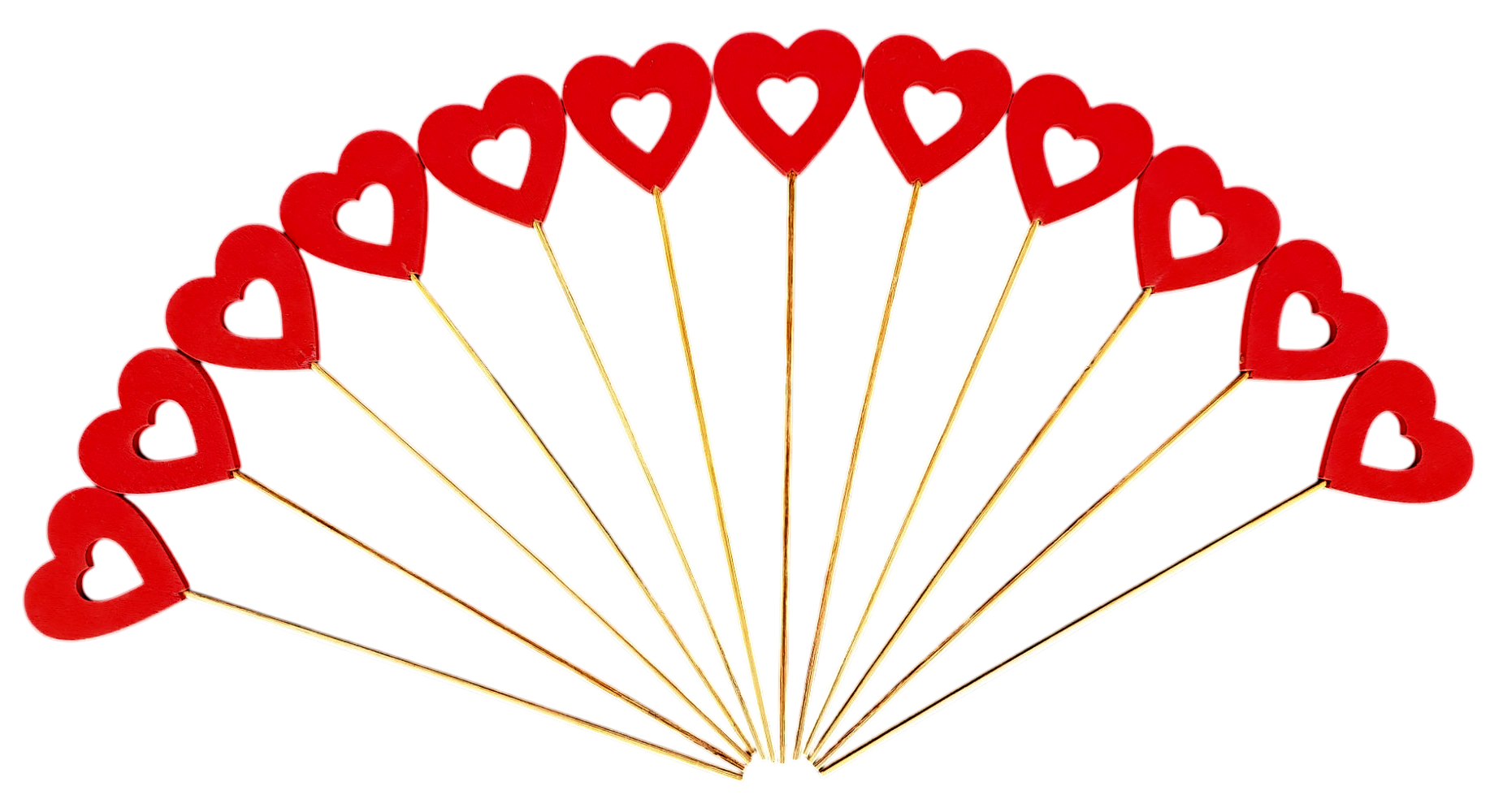 Dekoracja w kształcie serca na patyku – czerwona | 5 × 5 cm (24 cm z patykiem) | zestaw 12 sztuk
