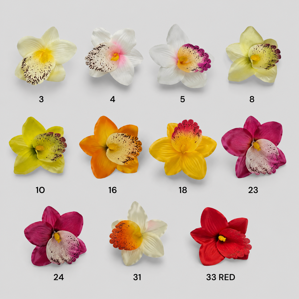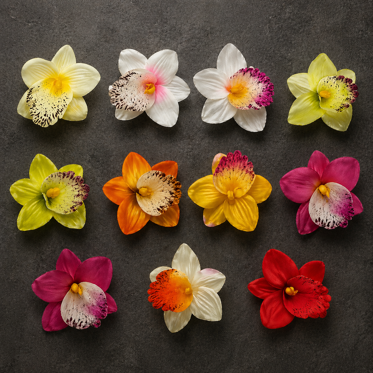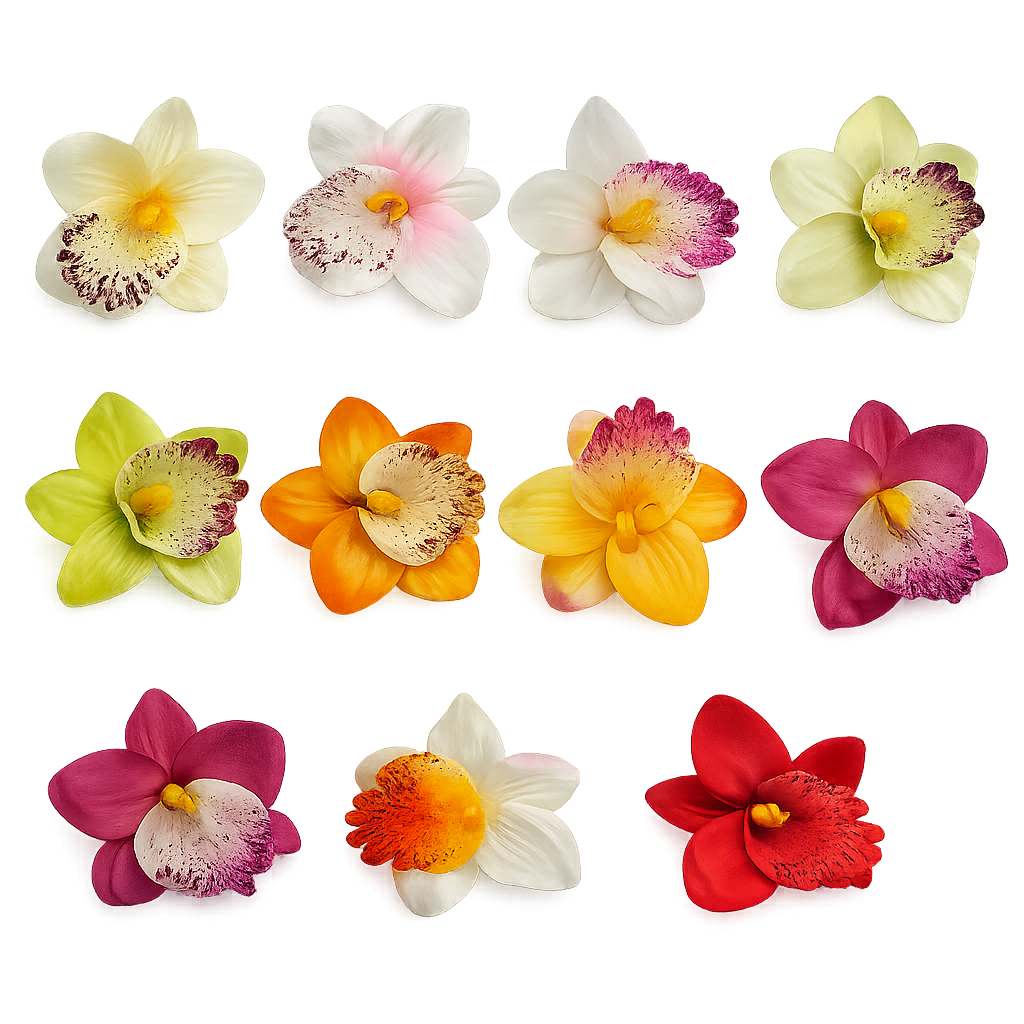Prezentowane główki storczyków zachwycają realistycznym odwzorowaniem naturalnych kwiatów. Delikatnie wyprofilowane płatki, subtelne przejścia kolorystyczne oraz dopracowane detale środka kwiatu sprawiają, że kompozycje z ich użyciem wyglądają niezwykle autentycznie i efektownie.