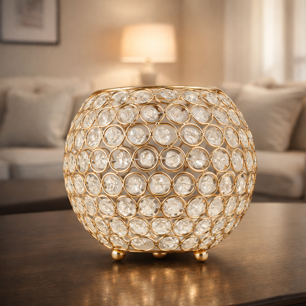 Elegancki świecznik dekoracyjny w formie kuli, który łączy luksusowy design z subtelnym blaskiem. Złota, ażurowa konstrukcja z metalowych obręczy została starannie wykończona i wzbogacona o transparentne kryształki, które efektownie rozpraszają światło świecy. Po zapaleniu tworzy wyjątkową grę refleksów, nadając wnętrzu ciepły, nastrojowy charakter.
